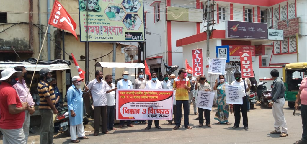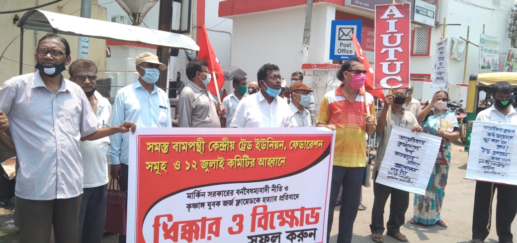 দৈনিক আবেশভূমি ডেস্ক :এগরা কাঁথি:পূর্ব মেদিনীপুর: সি আই টি ইউ ও ফেডারেশন সমূহ সহ ১২ই জুলাই কমিটির সম্মিলিত অাহ্বানে কাঁথি শহরে পোস্ট অফিস মোড়ে মার্কিন যুক্তরাষ্ট্রের বর্ণবৈষম্য নীতি,ডোনাল্ড ট্রাম্পের হুঙ্কার, শুধুমাত্র কৃষাঙ্গ হওয়ার অপরাধে জর্জ ফ্লয়েডের নির্মম হত্যাকাণ্ডের বিক্ষোভ কর্মসূচি পালিত হয় ৮ই জুন সোমবার। দেশজুড়ে বিভাজনের রাজনীতি ও করোনা ও অামফান মোকাবিলায় সরকারি ব্যর্থতার বিরুদ্ধেও বিক্ষোভ দেখান হয়। নেতৃত্ব দেন সিঅাইটিইউ নেতা হরপ্রসাদ ত্রিপাঠী,মামুদ হোসেন,কানাই মুখার্জী, জয়দেব পণ্ডা, প্রনব পণ্ডা, এঅাইটিইউসি নেতা উত্তম প্রধান, স্বপন পণ্ডা, মানিক লাল জানা, অমিত মান্না, অজিত পয়ড়্যা, ইউটিইউসি’র সেক হোসেন অালি, এবিটিএ’র সৌমিত্র সাহু,এবিপিটিএ’র কৃষ্ণেন্দু বারিক, ব্যাঙ্ক কর্মচারী সংগঠনের কমল তোলা,কো-অর্ডিনেশনের অনল দাস,পেনসনার্স ইউনিয়নের সোমনাথ মাল,শম্ভুনাথ দাস প্রমুখ।