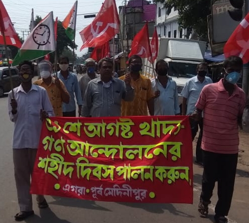প্রমুখ। কাঁথি-৩ এ কর্মসূচী তে নেতৃত্ব দেন ক্ষেতমজুর ইউনিয়ন নেতা কালীপদ শীট, হিমাংশু পণ্ডা, রাজনারায়ণ দাস, ঝাড়েশ্বর বেরা, প্রতাপ দাস,খাজা অাবুল অালি, অশোক পণ্ডা, স্বপন খাঁড়া, অনন্ত পণ্ডা প্রমুখ। কাঁথি-১ এ কর্মসূচী তে নেতৃত্ব দেন ক্ষেতমজুর ইউনিয়ন সম্পাদক তাপস অধিকারী, নন্দন রাউত, হরপ্রসাদ ত্রিপাঠী, কানাই মুখার্জি, ভবানী বেরা, প্রণব করন,বাসুদেব রাউল,হিমাদ্রি মাইতি,ভবানী পণ্ডা,অাবদুল রহিম বেগ প্রমুখ। খেজুরী-১ ও খেজুরী-২ ব্লকের কর্মসূচী তে নেতৃত্ব দেন ক্ষেতমজুর ইউনিয়নের রাজ্য সহ সম্পাদক হিমাংশু দাস, গোকুল ঘোড়াই, সেক জাহারাজ অালি, মৃন্ময় মাইতি, অতুল্য সুন্দর উকিল, সেক মহরম প্রমুখ। বক্তব্যে নেতৃত্বগণ বলেন – খাদ্যের দাবীতে অান্দোলন করতে গিয়ে ৩১ শে অাগষ্ট ১৯৫৯, অগণিত মানুষ’কে শাসকের গুলি ও বেয়নেটের সামনে শহীদ হতে হয়েছিল। তাছাড়া গরীব, খেটে খাওয়া মেহনতি মানুষের স্বার্থে লাগাতার আন্দোলনে প্রচুর মানুষ’কে মৃত্যু বরন করতে হয়েছে। সেই সমস্ত শহীদদের রক্তস্নাত পথ বেয়ে কেন্দ্র ও রাজ্য সরকারের জনবিরোধী নীতির বিরুদ্ধে তীব্র গণঅান্দোলন গড়ে তুলতে হবে।প্রতিটি কর্মহীন পরিবারকে মাসে মাসে মাথা পিছু বিনামূল্যে ১০ কেজি করে খাদ্য সামগ্রী ও প্রতিটি পরিবারকে মাসে মাসে ৭৫০০ টাকা অনুদান কেন্দ্র ও রাজ্য সরকার কে প্রদান করতে হবে।কর্মসংস্থানের লক্ষ্যে নারেগা প্রকল্পে ১০০ দিনের কাজ কে ২০০ দিন করা ও দৈনিক মজুরী ৬০০ টাকার দাবী অাজকের কর্মসূচী তে উত্থাপন করা হয়।