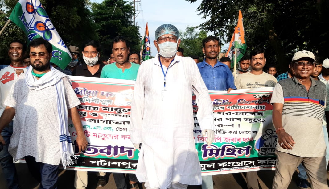 গৌরীশংকর মহাপাত্র: এগরা কাঁথি: পূর্ব মেদিনীপুর।বাংলার মানুষের বিরুদ্ধে মোদী সরকারের চক্রান্ত ও বঞ্চনার প্রতিবাদে কেন্দ্রীয় সরকার জনস্বার্থ নীতির বিরুদ্ধে পথে নামল রাজ্য শাসকদল তৃণমূল কংগ্রেস। রবিবার পটাশপুর ২ তৃনমূল কংগ্রেসের ডাকে প্রতিবাদ মিছিল ও পথসভা হয় বাঙ্গুই চক মোড়ে । প্রতিবাদ মিছিল শুরু হয় পটাশপুর পার্টি অফিস থেকে পেট্রোল পাম্প ঘুরে শেষ হয় পটাশপুর বাঙ্গুই চকমোড়ে। বাঙ্গুই চকমোড়ে তৃনমূল কর্মী দের নিয়ে প্রতিবাদ সভা হয়। ছিলেন বিধায়ক