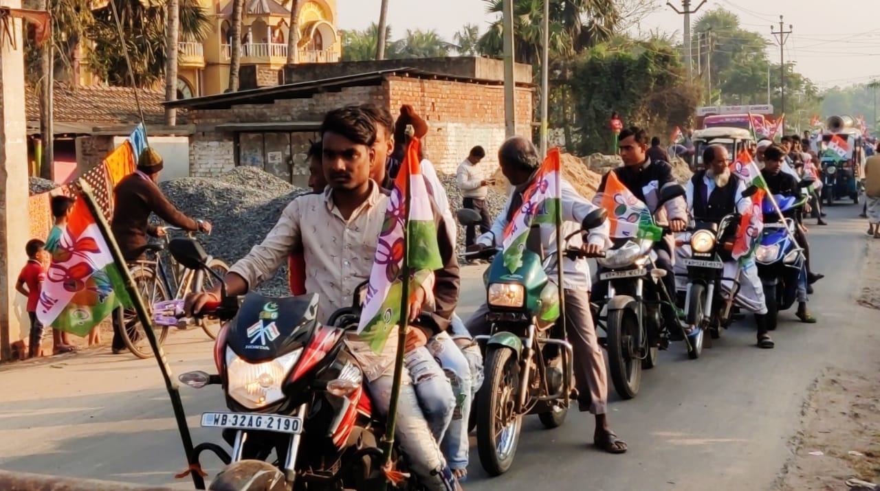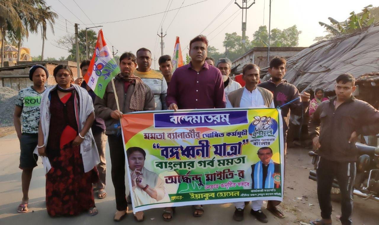 শুভম সিং ও রাজকুমার ভুঁইঃ ভগবানপুরঃ পূর্ব মেদিনীপুরঃ মুখ্যমন্ত্রী মমতা বন্দ্যোপাধ্যায়ের নির্দেশ মতো ভগবানপুর ১ ব্লক তৃণমূল কংগ্রেসের সম্পাদক আজিমুল হোসেন এর নেতৃত্বে বঙ্গধ্বনি যাত্রা উপলক্ষে বাইক র্যালি আয়োজিত হয় শুক্রবার।এদিন বাইক র্যালি লালপুর থেকে শুরু হয়ে গোটা ভগবানপুর এলাকা পরিদর্শন করে গান্ধী মূর্তি পাদদেশে বাইক র্যালি শেষ হয়। র্যালিতে ছিলেন বেঁউদিয়া অঞ্চল তৃণমূল কংগ্রেসের কার্যকরী সভাপতি ইয়াকুব আলি সহ অন্যান্য দলীয় কর্মীরা।