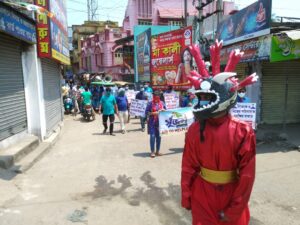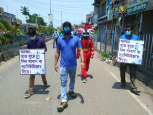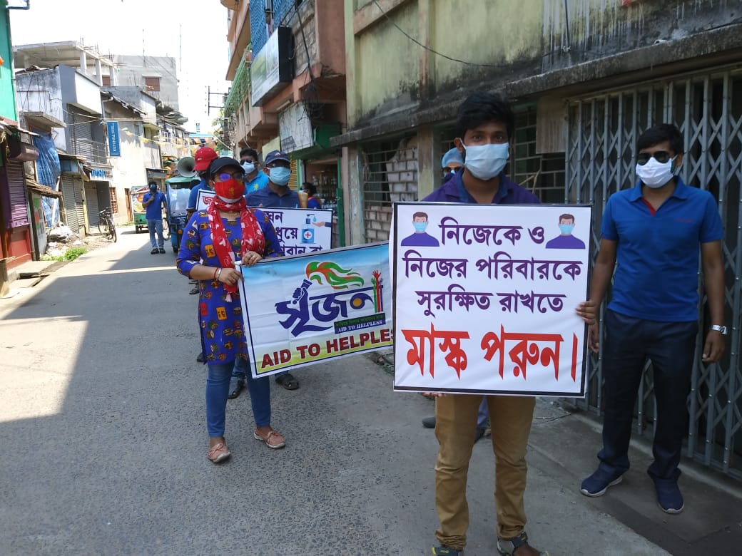 গৌরীশংকর মহাপাত্র:এগরা কাঁথি :পূর্ব মেদিনীপুর।কোভিডের দ্বিতীয় তরঙ্গে বিপর্যস্ত পরিস্থিতিতে সকলে যাতে সুরক্ষিত থাকতে পারে তার জন্য মেছাদয় “সৃজন”এর উদ্যোগে প্রচার অভিযান চালান হয় রবিবার। প্রতীকী করোনা মডেল নিয়ে সচেতনতার বার্তা হোর্ডিং নিয়ে মাইক প্রচার করে মেচেদা বাজার, বিভিন্ন পাড়া ও বাসস্ট্যান্ডে। সেইসাথে পশ্চিমবঙ্গ সরকারের নয়া নির্দেশিকা ক্রেতা, বিক্রেতা ও বাজারে পথ চলতি মানুষের জন্য সচেতনতা বার্তা দেওয়া হয়।হেল্পলাইনে ফোন করে মানুষ বিনামূল্যে অক্সিজেন সিলিন্ডার ও কন্সেন্ট্রেটর পেতে পারেন, বাড়িতে বসে স্বাস্থ্যবিধি মেনে ঔষধ ও খাওয়ার পেতে পারেন। পেতে পারেন স্বল্প খরচে এম্বুলেন্সও, টেলি মেডিসিন এর জন্য চিকিৎসার পরামর্শ পেতে পারেন কিংবা থ্যালাসেমিয়া শিশুদের জন্য রক্তের ডোনার পেতে পারেন এমন ঘোষণা করা হয়। সৃজনের পক্ষে ডাঃ শ্যামল আদক ও ঋত্বিক আদক বলেন যে- গত বছরের মতো এবারেও আমরা পরিস্থিতি অনুযায়ী প্রতিদিন কমিউনিটি কিচেন চালু করতে চলেছি সেই সাথে বরিষ্ঠ নাগরিকদের ইমিউনিটির কথা ভেবে পর্যায়ক্রমে হরলিক্স ও ফল এবং বাচ্চাদের বেবিফুড প্রদান করতে চলেছি, সাথে সাথে হকার পেশা’তে যুক্ত সহ কর্মহীন মানুষকে সহায়তা করার ইচ্ছে রয়েছে।