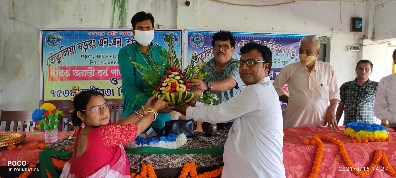 গৌরীশংকর মহাপাত্র : দৈনিক আবেশভূমি :এগরা কাঁথি :পূর্ব মেদিনীপুর।৭৫তম স্বাধীনতা দিবস উদযাপনের পাশাপাশি তেঁতুলিয়া ষড়রং এন এন হাই স্কুলের হীরক জয়ন্তী বর্ষ পালনের শুভ সূচনা হয় এ দিন। সকালে শিক্ষক – পরিচালন সমিতির সদস্য-প্রাক্তন শিক্ষক শিক্ষাকর্মীদের উপস্থিতিতে জাতীয় পতাকা উত্তোলন করেন বিদ্যালয়ে প্রধান শিক্ষক শিক্ষারত্ন বীরকুমার শী। দ্বিতীয়পর্বে বিদ্যালয়ের পতাকা উত্তোলনের মাধ্যমে বিদ্যালয়ের হীরক জয়ন্তী বর্ষ পালনের শুভ সূচনা হয়। বিদ্যালয়, শিক্ষাশিক্ষা কর্মী পার্শ্বশিক্ষক, প্রাক্তনীদের পক্ষ থেকে নব নিযুক্ত প্রিয় বিধায়ককে পুষ্পস্তবক, উত্তরীয়, স্মারক দিয়ে সম্বর্ধনা জ্ঞাপন করেন। কোভিড পরিস্থিতিতে ছাত্রছাত্রীরা উপস্থিত হতে না পারলেও ভার্চুয়ালি তারা আবৃত্তি, সঙ্গীত এবং নৃত্য পরিবেশন করে। প্রধান শিক্ষক মহাশয় আশা প্রকাশ করেন, আগামী দিনে আমরা কোভিড জয় করতে পারবো এবং আগামী ১৫-১৭ জানুয়ারি বিদ্যাসাগরের মূর্তি প্রতিষ্ঠা, রক্তদান শিবির, সমাজভিত্তিক বনসসৃজন এবং শিক্ষা সংক্রান্ত সেমিনার সহ বিভিন্ন অনুষ্ঠান করতে পারবেন। জেলার দক্ষিণ পশ্চিম সীমান্তের ও পশ্চিম মেদিনীপুর জেলার প্রবেশ দ্বারের এই বিদ্যালয়ের শ্রীবৃদ্ধিতে আশু কয়েকটি পরিকল্পনার উল্লেখ করে উপস্থিত প্রধান অতিথির দৃষ্টি আকর্ষণ করে প্রয়োজনীয় সহযোগিতা চান। প্রধান অতিথি জনপ্রিয় বিধায়ক শিক্ষাবিদ তরুন কুমার মাইতি তার বক্তব্যে এই বিদ্যালয়ের সঙ্গে তাঁর দীর্ঘ দিনের নিবিড় সম্পর্কের উল্লেখ করে বিদ্যালয়ের পাশে থেকে ক্ষমতার সীমাবদ্ধতায় সর্বোত সহযোগিতার আশ্বাস দেন। ঐ দিন প্রাক্তন শিক্ষক চিত্তরঞ্জন জানার আর্থিক সহযোগিতায় একটি ডায়াসেরও উদ্বোধন হয়। অনুষ্ঠানে পৌরোহিত্য করেন বিদ্যালয়ের স্বীকৃত সময়ের প্রথম প্রধান শিক্ষক পরশুরাম মাদুলী।অনুষ্ঠানের সঞ্চালনায় সহ শিক্ষক কানাইলাল সিংহ। সভার শেষে উপস্থিত সকলকে ধন্যবাদ জ্ঞাপন করেন পরিচালন সমিতির সভাপতি অনুপ মাইতি।