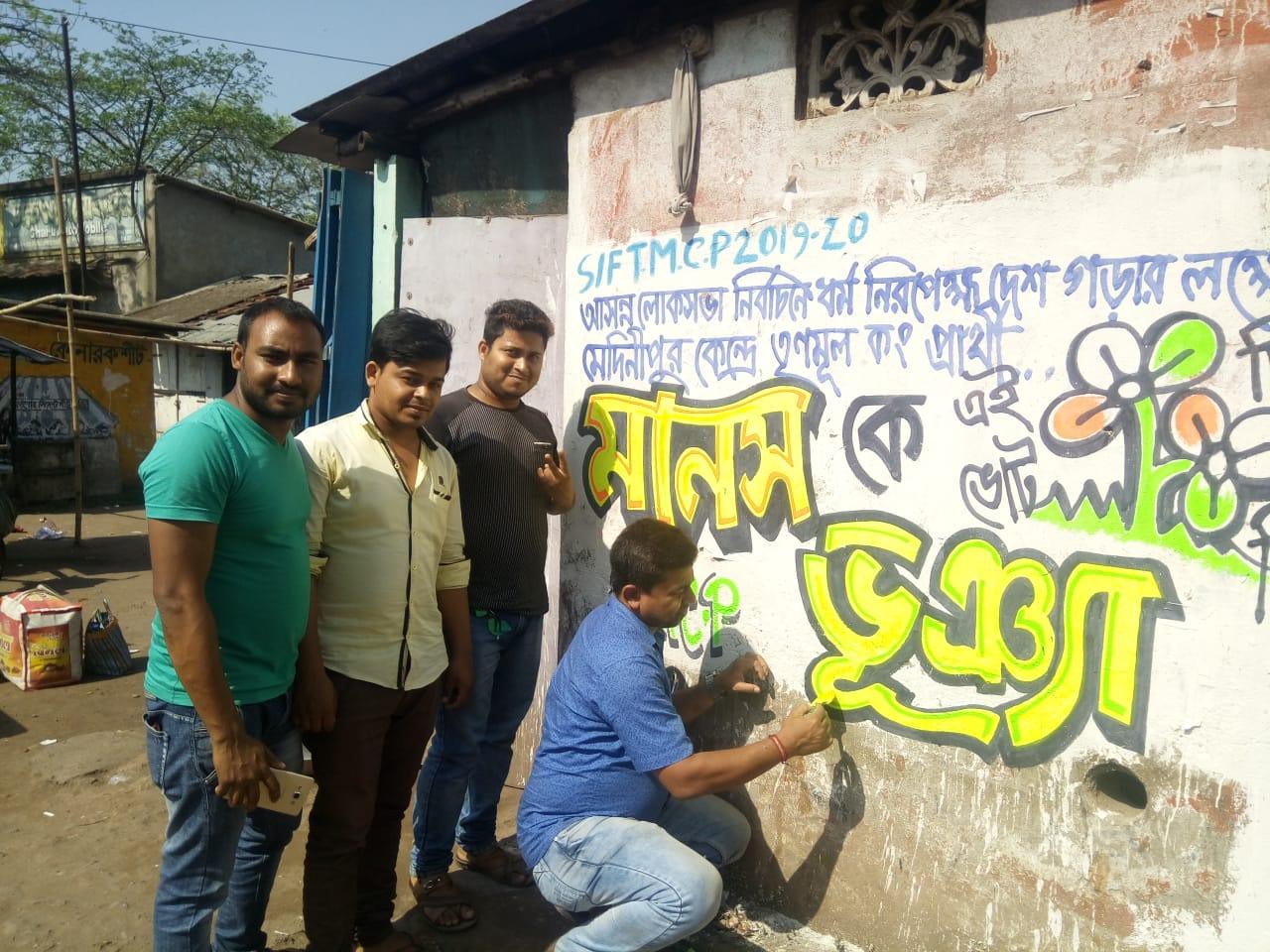 গৌরীশঙ্কর মহাপাত্র , এগরা : মেদিনীপুর লোকসভা কেন্দ্রে তৃণমূল প্রার্থী ডাঃ মানস ভূঞার সমর্থনে এগরায় দেওয়াল লিখেছেন ছাত্র নেতা উদয় পাল ও তার সঙ্গীগন।