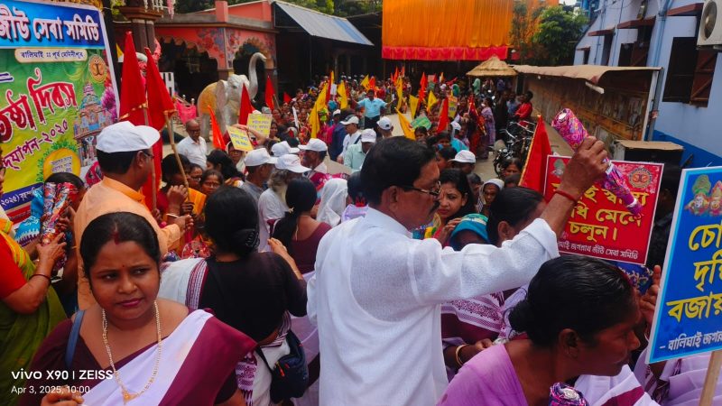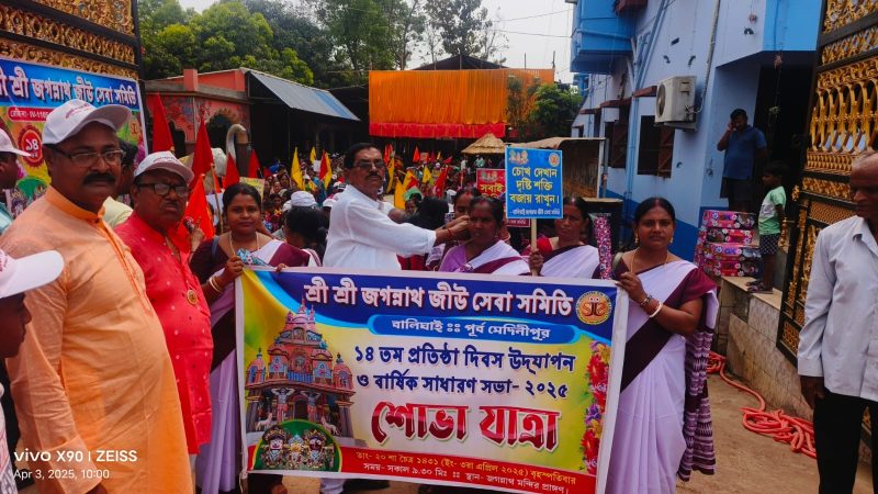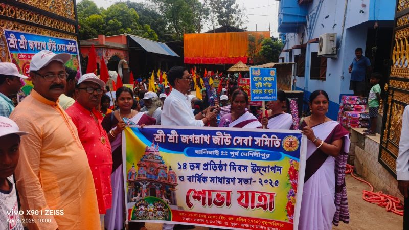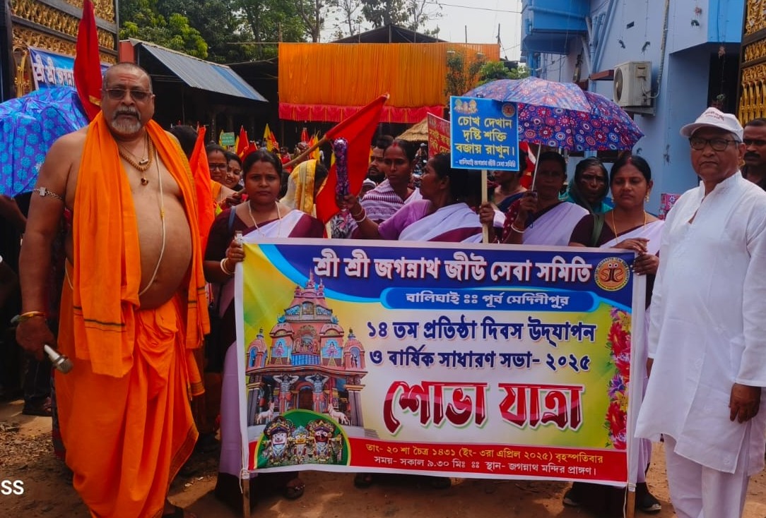 গৌরীশংকর মহাপাত্র,আবেশভূমি, এগরা কাঁথি, মেদিনীপুর পূর্ব পূর্ব মেদিনীপুর।এগরা-২ ব্লকের ঐতিহ্যবাহী সেবা ট্রাস্ট বালিঘাই শ্রী শ্রীজগন্নাথ জীউ সেবা সমিতি পরিচালিত জগন্নাথ দেবের মন্দির ও বিগ্রহের ১৪তম প্রতিষ্ঠা দিবস উদযাপন হয় ৩ এপ্রিল বৃহস্পতিবার।এই উপলক্ষে সকালে সংস্থার পতাকা উত্তোলন শেষে বর্ণাঢ্য শোভাযাত্রার সূচনা করেন ট্রাস্ট সম্পাদক একালে দানবীর আশিস ধাওয়া। ট্রাস্টের অধীন জেলার ৭৩ ক্লাব ও সংস্থার মধ্যে পার্শ্ববর্তী সংস্থা, স্বসহায়ক দলের ১৫০ মহিলা ,নোয়াপাড়া নারী সুরক্ষার- ৫০ সদস্যা, দোবাঁধি সোনার তরী, এরেন্দা হরিসমাজ, দাউদপুর পল্লী উন্নয়ন, শিলামপুর তরুণ সংঘ, রঘুনাথচক, শিলামপুর ঐক্য সম্মেলনী, মংরাজ রামকৃষ্ণ পরমহংস সেবক সংঘ,দক্ষিণ খাড় স্টার ক্লাব, ভবানীচক মৈত্রী সংঘ, ভাড়দা অক্ষয় নারায়ন, বালিঘাই বিবেকানন্দ ব্যামাগার প্রভৃতি ৪৫টি ক্লাবের প্রায় ২ (দুই)হাজার নারী পুরুষ শোভাযাত্রায় পা মেলায়। শোভাযাত্রায় খোল কীর্তন, ব্যান্ড সহযোগে বালিঘাই বাজার, শুটকি বাজার, বাস স্ট্যান্ড, ত্রিকোণ পার্ক ও বিডিও অফিসের রাস্তা ধরে মন্দির প্রাঙ্গনে ফিরে আসে। সকলের হাতে উত্তাপ নিয়ন্ত্রণে সেবা সমিতির পক্ষে একটি করে ছাতা উপহার দেওয়া হয়। এদিকে প্রতিষ্ঠা দিবসে সংস্থার মঙ্গল কামনায় জগন্নাথ মন্দির প্রাঙ্গণে যজ্ঞ এর নেতৃত্বে কলিয়াচক সংস্কৃত কলেজের অধ্যক্ষ ড. দেবীপদ রথের নেতৃত্বে একদল পুরোহিত। দুপুরে ২৫০০ মানুষের মধ্যাহ্নভোজের আয়োজন ছিল।এদিন অন্যান্যদের মধ্যে উপস্থিত ছিলেন সংস্থার সভাপতি অম্বিকেশ মহাপাত্র, কার্যকরী সভাপতি অহীন্দ্র কুমার রায়, যুগ্ম সহ- সম্পাদক জন্মেন্জয় প্রধান ও বিরজাকান্ত প্রধান, শিক্ষক তপন কুমার মন্ডল, জগন্নাথ কোলা কেন্দ্রের অধ্যক্ষ শিশির কুমার মাইতি ,অন্যতম কর্মকর্তা বিবেকানন্দ পঞ্চায়েতের প্রাক্তন উপপ্রধান ধনঞ্জয় সিংহ, এগরা-২ পঞ্চায়েত সমিতির প্রাক্তন সভাপতি প্রকাশ রায়চৌধুরী, সোহেল ধাওয়া ,সোমনাথ প্রধান, তপন কুমার সামন্ত, বিশ্বম্ভর রায়, তারাপদ রথ, সুকুমার মান্না, সমীর কুমার নায়ক, রাখাল চন্দ্র জানা ,মান গোবিন্দ জানা, কানাইলাল কুঁয়র, দিলীপ মহাপাত্র ,টুকুরানি পানিগ্রাহী প্রমুখ।সম্পাদক আশিস বাবু জানান আগামী শনিবার দেবদেবীর পূজার্চনা, রবিবার বিকালে জগন্নাথ কলা কেন্দ্রের ছাত্র-ছাত্রীদের দ্বারা পরিবেশিত বার্ষিক সাংস্কৃতিক অনুষ্ঠান গত রবিবার অনুষ্ঠিত সাংস্কৃতিক প্রতিযোগিতার পুরস্কার বিতরণী, ৯ এপ্রিল বুধবার বিকালে বার্ষিক সাধারণ সভা ও জগন্নাথ পত্রিকা প্রকাশ। ঐ দিন নৈশভোজে কয়েকদিনের বার্ষিক অনুষ্ঠানের সমাপ্তি ঘটবে। রোদ উপেক্ষা করে এ দিন শোভাযাত্রায় অংশ নেওয়া সকলকে ধন্যবাদ জ্ঞাপন করেন সম্পাদক আশিস