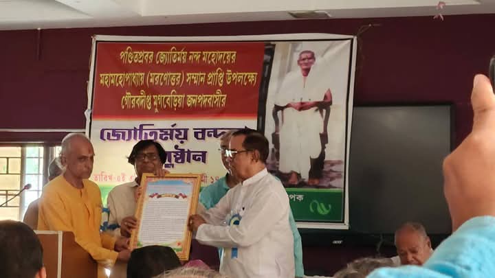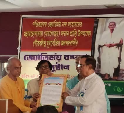 গৌরীশঙ্কর মহাপাত্র ও রাজকুমার মহাপাত্র,আবেশভূমি ডিজিটাল, এগরা কাঁথি, মেদিনীপুর পূর্ব পশ্চিম ও ঝাড়গ্ৰাম।পন্ডিত প্রবর জ্যোতির্ময় নন্দ মহোদয়ের মরণোত্তর সম্মান প্রাপ্তি উপলক্ষে গৌরবদীপ্ত মুগবেড়িয়া জনপদবাসীদের প্রায় ৪০ টি সংগঠন সমূহের উদ্যোগে জ্যোতির্ময় বন্দনার আয়োজন হয় ৫ এপ্রিল শনিবার।আড়াইটা থেকে ছয়টা পর্যন্ত ভাবগম্ভীর মনোজ্ঞ অনুষ্ঠানে ছিলেন প্রায় ১৫০ জন, এনসিসি ২০ সহ কলকাতা থেকে মেদিনীপুর সমন্বয় সংস্থার সভাপতি আঞ্চলিক ইতিহাস গবেষক বহু গ্ৰন্থ প্রনেতা সাহিত্যিক মন্মথনাথ দাস,প্রতিষ্ঠাতা সম্পাদক অধ্যাপক প্রণবেশ জানা,সাধারণ সম্পাদক রতিকান্ত মালাকার, সহ সম্পাদক অধ্যাপক শ্যামাপদ জানা, কাঁথি এগরা আঞ্চলিক ইউনিটের অধ্যাপক হৃষীকেশ পড়্যা, হৃষীকেশ দাস ও অলকা জানা, সুমন নারায়ণ বাকরা সহ খেজুরী জনপদের ৪ জন,তমলুক থেকে বিধান চন্দ্র সামন্ত প্রমুখ।পৌরোহিত্য করেন মুগবেড়িয়া কলেজের প্রাক্তন অধ্যক্ষ বহু গ্ৰন্থ প্রনেতা আঞ্চলিক ইতিহাস গবেষক ডঃ হরিপদ মাইতি।মুগবেড়িয়া গঙ্গাধর মহাবিদ্যালয়ের সভাগৃহে আয়োজিত এই অনুষ্ঠানে প্রাক্তন মন্ত্রী কিরণময়,পুরাণরত্ন অধ্যাপক ব্রহ্মময় ও প্রাবন্ধিক চৈতন্যময় নন্দ তিন কৃতি ভাইয়ের হাতে সম্মাননা মানপত্র তুলে দেন অধ্যাপক রণজিৎকুমার নায়েক। বাঁধাই করা স্মারক তুলে দেওয়া হয় ১০ জন ব্যক্তি ও প্রতিষ্ঠানের হাতে। প্রারম্ভিক ভাষণ দেন মুগবেড়িয়া কলেজের অধ্যক্ষ ডঃ স্বপন কুমার মিশ্র। দীর্ঘ আকর্ষণীয় ভাষণ দেন সভাপতি অধ্যাপক হরিপদ মাইতি। সঞ্চালক ছিলেন শ্রী গৌরচাঁদ পাত্র।